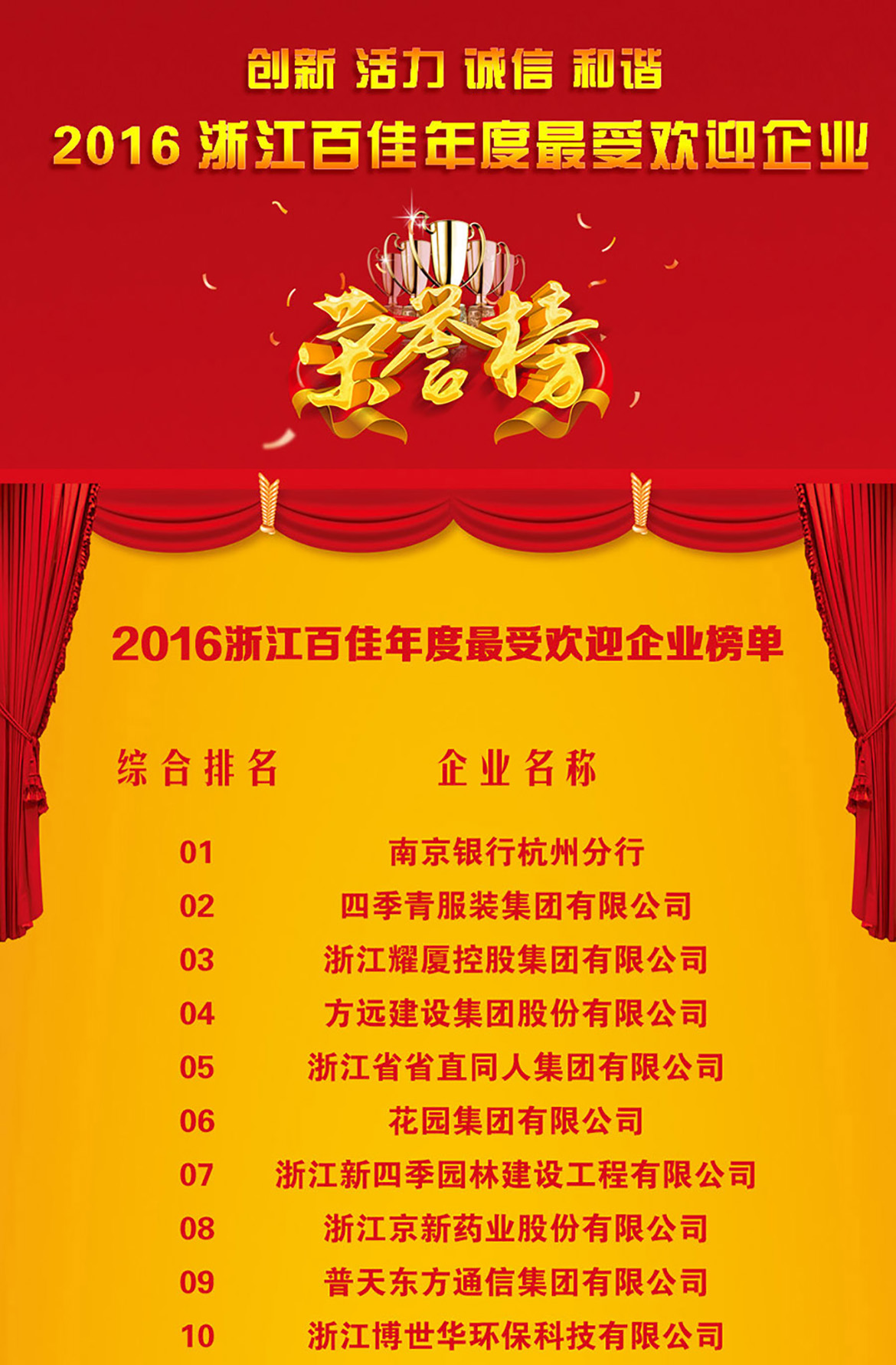 為推動浙江省企業(yè)的誠信和諧經(jīng)營,增添企業(yè)的創(chuàng)新發(fā)展活力和動力,由浙江經(jīng)濟網(wǎng)、新華網(wǎng)浙江頻道主辦,由中共浙江省委政法委員會、浙江省人大內務司法委員會、浙江省人民檢察院、浙江省科學技術廳、浙江省公安廳、浙江省環(huán)境保護廳、浙江省住房和城鄉(xiāng)建設廳、浙江省國家稅務局、浙江省政協(xié)經(jīng)濟委員會、浙江省總工會、新華網(wǎng)等單位指導,于2016年12月聯(lián)合舉辦的“2016浙江百佳年度最受歡迎企業(yè)” 榮譽榜推選活動日前揭曉,我公司在眾多參評企業(yè)中脫穎而出,取得了第十名的佳績。