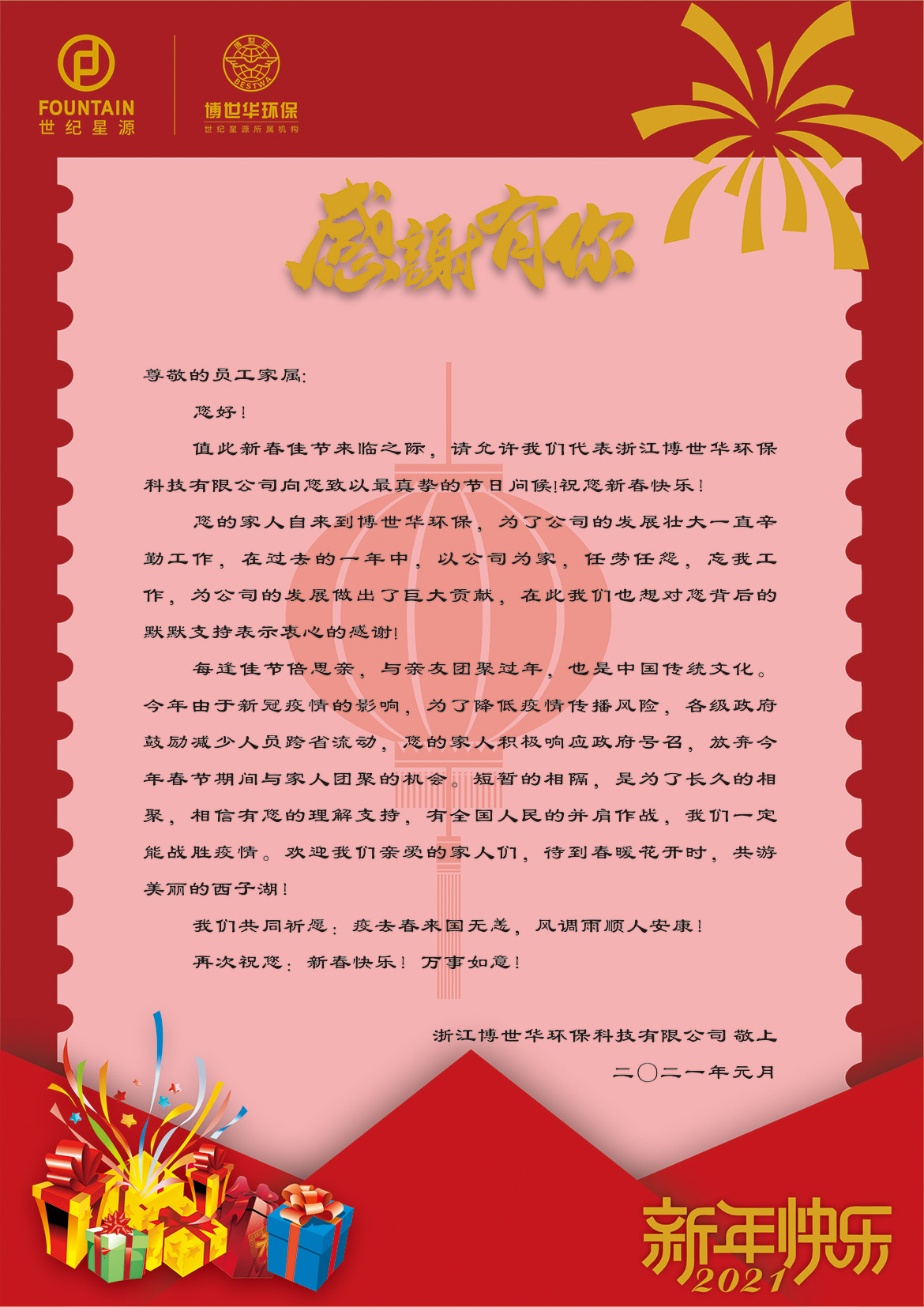 送“溫暖”:公司的發展壯大,離不開每一位員工家屬的鼎力支持和默默奉獻。公司加大對假期堅守崗位、不能回家與親人團聚的員工的關愛,通過“春節大禮包寄親人”等活動,把博世華環保對員工的關心、關愛傳達給留杭、留項目員工家屬。近日,一個個寄托美好祝福的大禮包已陸續寄送至員工家屬手中,有家屬在收到大禮包后,激動地發來感謝信,感謝公司就如同員工的父母一樣,呵護關懷著每一名員工生活及成長,同時也表達出對員工主動留杭的支持及理解。